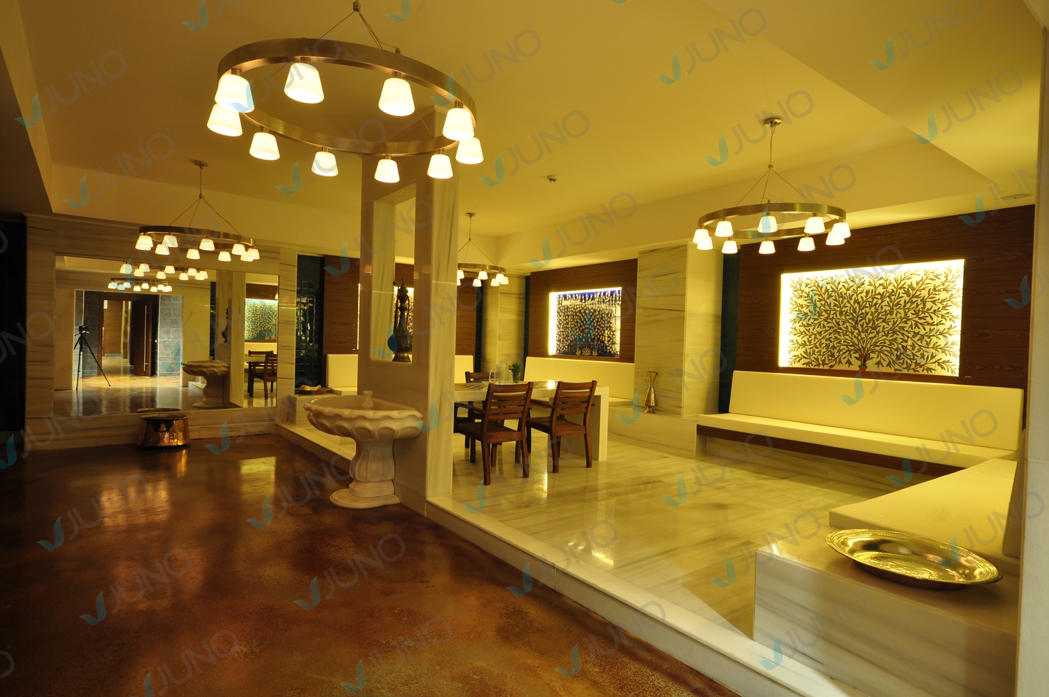 Genel MekanlarSpa Wellness’ın girişinde misafirlerini karşılayan, özel ve rutin dışında bir mekana girdiklerini hissettiren rahatlatan mekanlar tasarlıyor ve üretiyoruz. Dinlenme bölümleri, cafe, havuz ve çeşme düzenlemeleri, koridor ve zemin detayları, özel nitelikli kapılar, duvar kaplamaları, nişler, mobilyalar ve aksesuarlar ile zenginleştirilen seçkin mekanlar Juno spa firmasının önceliğidir.